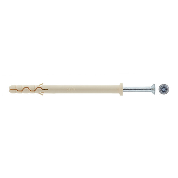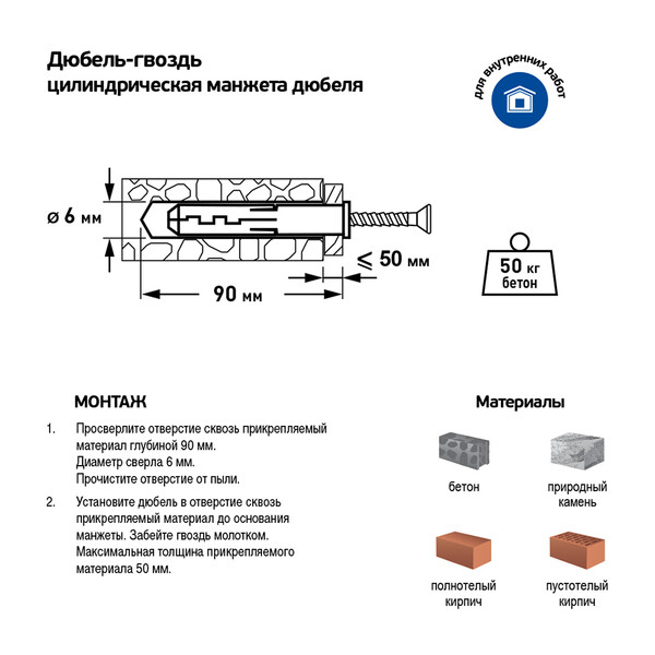 Предназначен для легких креплений (небольшие нагрузки) в твердые материалы: полнотелый кирпич, бетон, природный камень. Нейлон обеспечивает надежное сцепление с материалом основания. Резьбовой оцинкованный гвоздь повышенной прочности заранее установлен в дюбель.