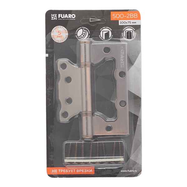 Универсальная дверная петля без врезки Fuaro 500-2BB/BL изготовлена из стали. Предназначена для установки на деревянные двери, подходит для дверей правого и левого открывания. Не требует врезки. Гальваническое покрытие прошло тест на устойчивость к коррозии в соляном тумане – более 96 часов, что соответствует высшему 4 классу стойкости покрытия. Края петель прошли дополнительную полировку. В петле 500-2BB/BL установлены два внутренних подшипника и стальной стержень, что обеспечивает 1 млн циклов открывания/закрывания. Благодаря двум опорным подшипникам, петля устойчива к проседанию. Максимальная нагрузка на 2 петли 35 кг, на 3 петли 45 кг. Размер петли: 100x2,5. Саморезы в комплекте.