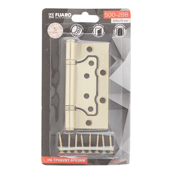 Универсальная дверная петля без врезки Fuaro 500-2BB/BL изготовлена из стали. Предназначена для установки на деревянные двери, подходит для дверей правого и левого открывания. Не требует врезки. Гальваническое покрытие прошло тест на устойчивость к коррозии в соляном тумане – более 96 часов, что соответствует высшему 4 классу стойкости покрытия. Края петель прошли дополнительную полировку. В петле 500-2BB/BL установлены два внутренних подшипника и стальной стержень, что обеспечивает 1 млн циклов открывания/закрывания. Благодаря двум опорным подшипникам, петля устойчива к проседанию. Максимальная нагрузка на 2 петли 35 кг, на 3 петли 45 кг. Размер петли: 100x2,5. Саморезы в комплекте.