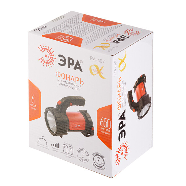 Мощный аккумуляторный фонарь-прожектор, создающий 650 метров освещения. Яркий ровный свет за счет светодиодной технологии последнего поколения. Фонарь отличается приятным дизайном и комфортом в использовании. В комплекте microUSB-кабель для подзарядки, имеется индикатор уровня заряда. При полном заряде работает непрерывно 6 часов. Благодаря емкому литиевому аккумулятору (2400 мАч) фонарь долго светит и мало весит. Удобно брать с собой, переносить, подвешивать и устанавливать на поверхность в качестве светильника. Идеальный вариант для кемпинга! Многофункциональность ЭРА PA-607 обеспечивается 7 режимами работы – разные уровни яркости, мигание, дальний свет, светильник, дальний свет + светильник. Эргономичная ручка и поворотный подвес.