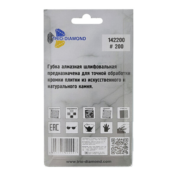 Губка шлифовальная алмазная Trio-Dimond является вспомогательным ручным инструментом мастера-плиточника. Она используется для шлифовки и полировки твердых материалов, таких как мрамор, гранит, керамогранит и стекло. Эта губка позволяет точно обрабатывать кромку плитки и удалять мелкие сколы, возникшие после распила плитки.