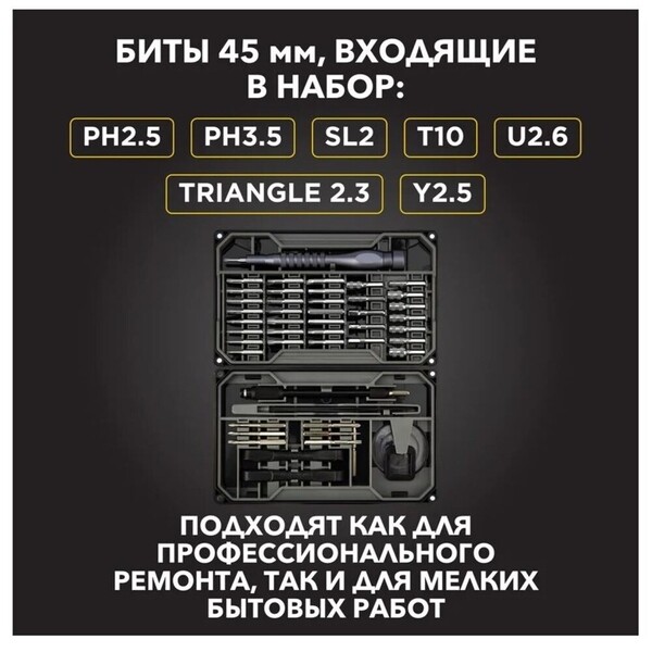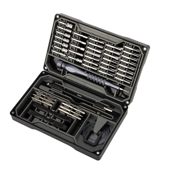 Набор отверток для точных работ Kranz можно использовать для ремонта телефонов, компьютеров, приемников и для многих других приборов, которые используются в быту. Выполнен из стали S2, обладающей высокой прочностью к механическим повреждениям. Точно подобранные по характеристикам магнитные насадки подходят для профессионального ремонта и для мелких бытовых работ. В наборе 73 предмета.