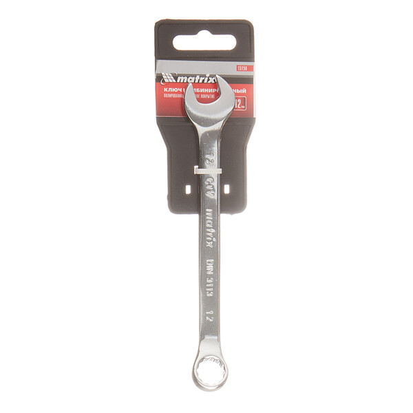 Ключ комбинированный Matrix предназначен для закручивания резьбовых соединений, изготовлен из хромованадиевой стали. Твердость материала рабочей части ключа 45 HRC (требования ГОСТ – 45–51 HRC). Ключ имеет полированное хромоникелевое покрытие. Профиль кольцевого зева имеет 12 граней, что увеличивает площадь соприкосновения рабочих поверхностей и снижает риск деформации граней крепежа при монтаже. Угол наклона кольцевого зева относительно плоскости ключа в 15 градусов делает монтаж более удобным. Ключ гаечный комбинированный с открытым и кольцевым зевом предназначен для монтажа (демонтажа) резьбовых соединений.