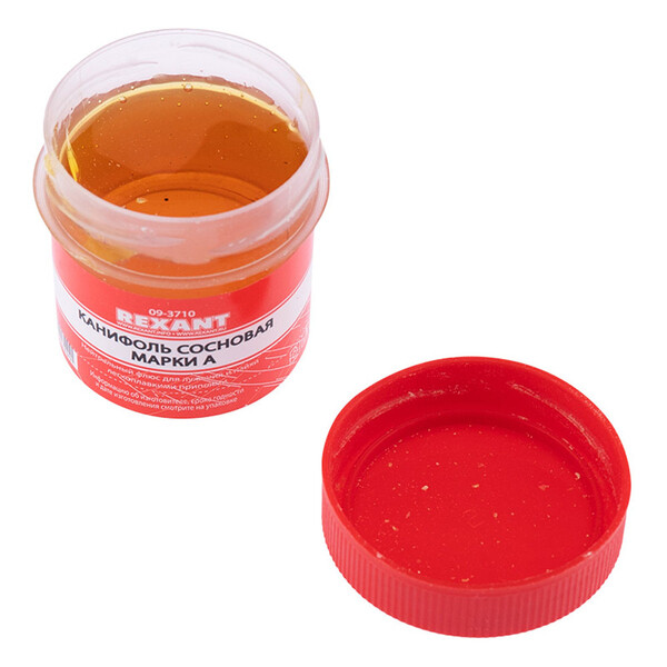 Канифоль сосновая марки А 20 г REXANT предназначена для удаления тонких и нестойких оксидов с поверхности под пайку, улучшения растекания жидкого припоя при пайке печатных плат и радиокомпонентов. Канифоль — хрупкое, стекловидное вещество темно-красного или светло-желтого цвета, применяется в качестве нейтрального флюса при пайке и лужении деталей или поверхностей припоями оловянно-свинцовой группы. Она входит в состав смол хвойных деревьев и получается из живицы. После пайки смывка не требуется.