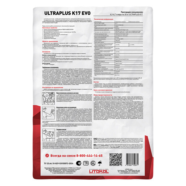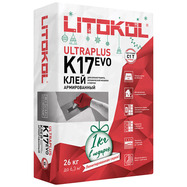 Litokol К17 профессиональная клеевая смесь на цементной основе обладает высокими адгезивными свойствами и предназначена для укладки керамогранита, керамической плитки (одно – и двукратного обжига) размером до 60х60 см, керамической мозаики. Для внутренних и наружных работ, для помещений с любым уровнем влажности.