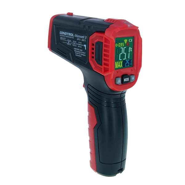 CONDTROL Maxwell 3 – инфракрасный пирометр, предназначенный для мониторинга тепловых потерь, поиска мостиков холода, зон утечки тепла, засоров в системе теплоснабжения, перегрева подвижных деталей в автомобилях и механизмах. Диапазон измерений температуры поверхности от – 30 °С до 380°С. Отличительная особенность, наличие кругового лазерного прицела. Эргономичная конструкция и небольшой вес (всего 130 гр) позволяют проводить измерения в течение длительного времени. При необходимости прибор можно закрепить на ремне и заниматься другими видами работ.