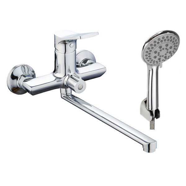 Смеситель для ванны однорычажный с длинным изливом с аксессуарами изготовлен из безопасной для здоровья латуни. Латунный корпус устойчив к перепадам давления и температур, не подвержен коррозии. Хром-никелевое покрытие устойчиво к истиранию и потускнению. Смеситель комплектуется керамическим картриджем, который обеспечивает бесшумную работу изделия, плавное переключение рукоятки, а также точность регулировки температуры и напора воды. Пластиковый аэратор насыщает поток пузырьками воздуха, что делает воду мягкой и исключает образование брызг. Флажковый керамический переключатель ванна/душ позволяет с комфортом пользоваться лейкой даже при низком давлении воды.