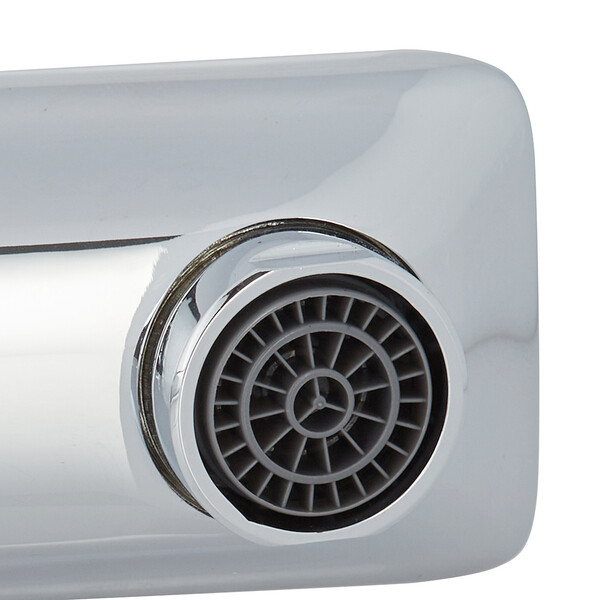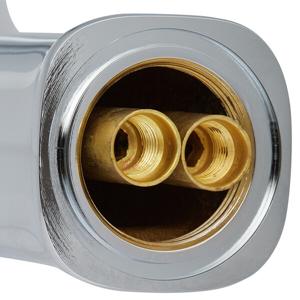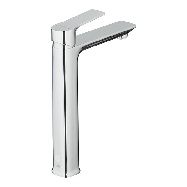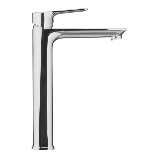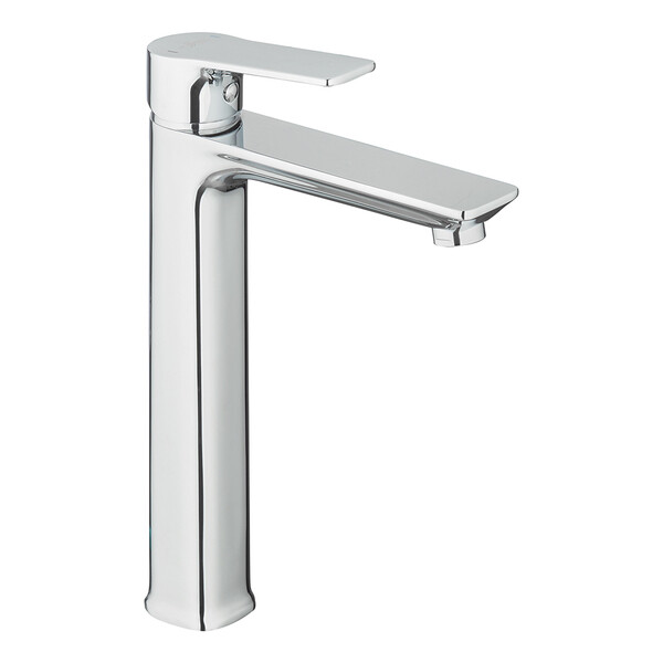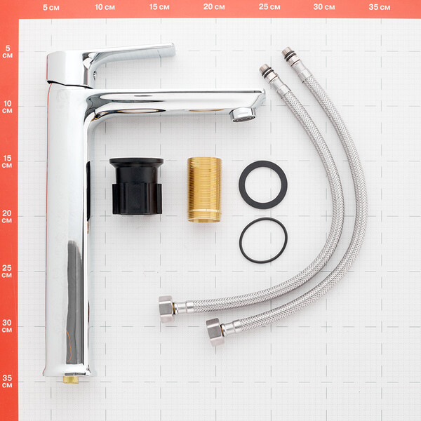 Смеситель для раковины выполнен из латуни. Поверхность смесителя гладкая с глянцевым блеском.
