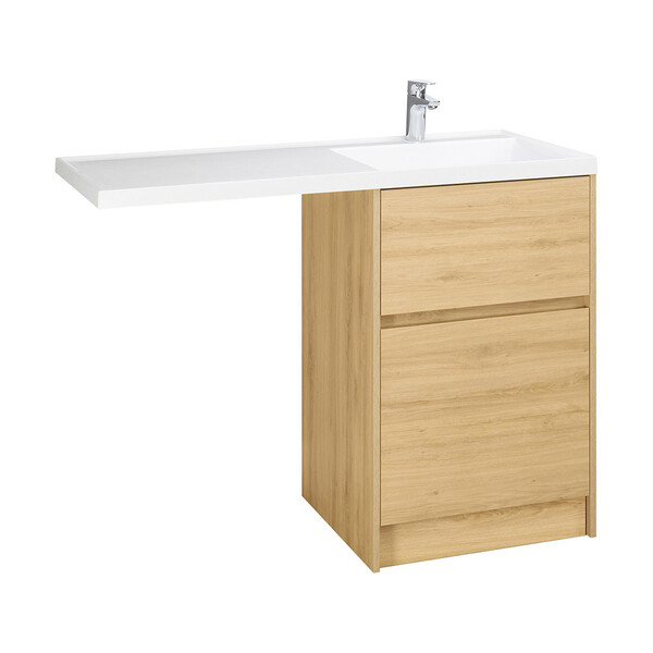 Комплект фасадов для тумбы Лондри под стиральную машину выполнен из влагостойкой ламинированной плиты в древесной отделке цвета Дуб сантана. Корпус тумбы и фасад приобретаются отдельно.
