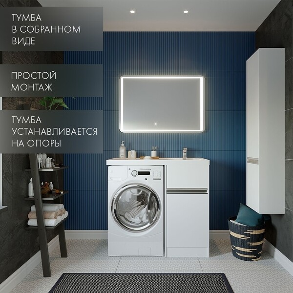 Тумба Лондри под стиральную машину выполнена из влагостойкой ламинированной плиты и окрашена в белоснежный цвет с высокой степенью глянца полиэфирной краской ультрафиолетового отверждения. Данный способ окрашивания обеспечивает изделию привлекательный внешний вид, а также износостойкость и долговечность. Верхний ящик открывается с помощью системы push-to-open, а нижний – за изящную удобную профильную хромированную ручку. Над ручкой установлена вставка из влагостойкой ламинированной плиты благородного цвета дуб наварра. Ящики выдерживают нагрузку до 25 кг. Тумба установлена на регулируемые опоры, которые находятся за цоколем. Тумба комплектуется раковиной Лондри 105 из прочного литого мрамора, который устойчив к воздействию химических средств. Широкое крыло раковины обеспечивает ванную комнату дополнительным функциональным пространством....