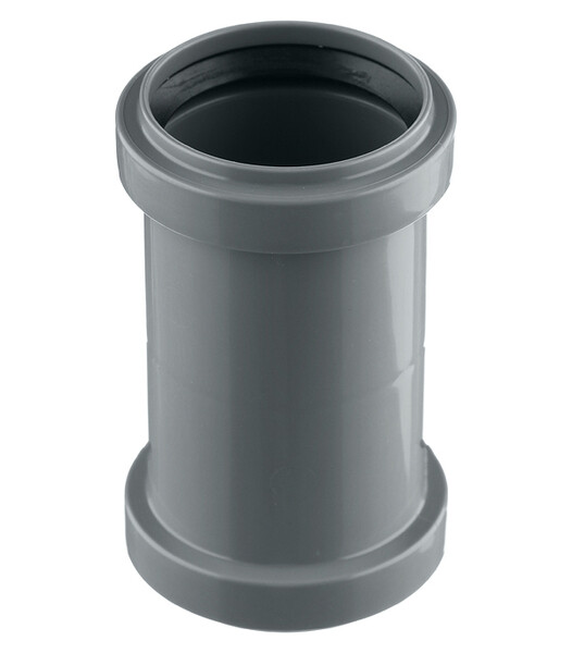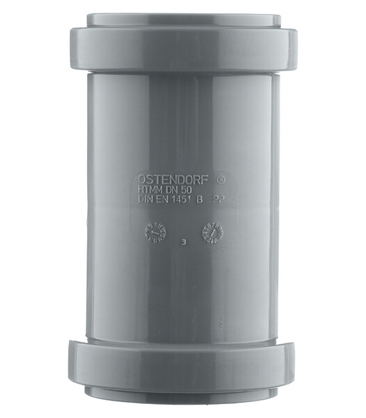 Внутренняя система канализации Ostendorf HT. Муфта двойная, предназначена для соединения безраструбных частей труб и фитингов, центральный упор внутри муфты обеспечивает соединение равных участков и в случае необходимости облегчает выставление отступа с расчётом на тепловое расширение.