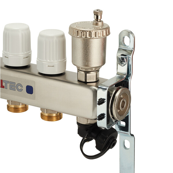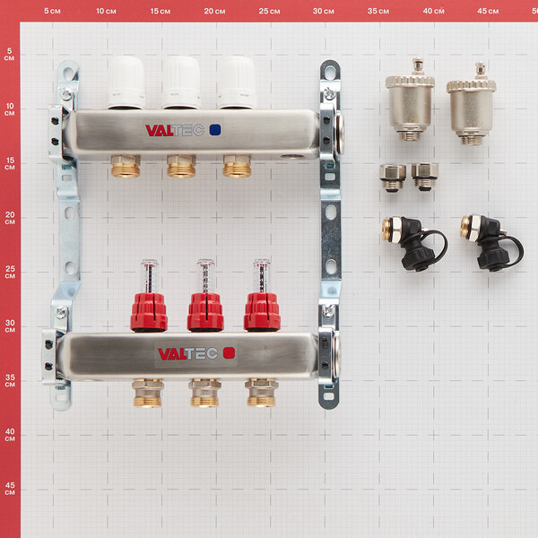 Коллекторный блок для распределения теплоносителя по петлям теплого пола или по приборам отопления. Выходы подающего коллектора укомплектованы ручными регулировочными клапанами с расходомерами, обратного – ручными запорными клапанами, на которые можно установить электротермические сервоприводы. Каждый коллектор имеет автоматический воздухоотводчик и дренажный клапан. Присоединение циркуляционных петель осуществляется с помощью фитингов стандарта «евроконус».