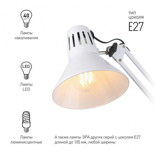 Настольный светильник ЭРА N-121-E27-40W-W классического дизайна может использоваться с разными источниками света – лампой накаливания, компактной люминесцентной лампой (КЛЛ) или светодиодной (LED) лампой. Выключатель на проводе. Крепится на струбцину. Высота плафона регулируется двухсекционной сгибающейся стойкой, направление света – поворотом и наклоном плафона в любом направлении. Лампочка в комплект не входит.