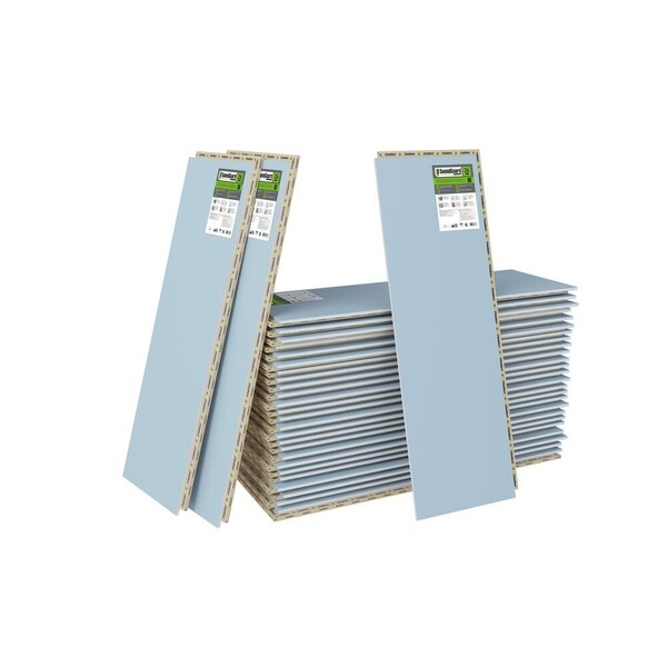 Комбинированная панель, состоящая из двух слоев, соединенных внахлест. Подобная конструкция позволяет облегчить и ускорить монтаж звукоизоляционных систем. Продукт сочетает преимущества панели с кварцевым наполнением и звукоизоляционного гипсокартонного листа высокой плотности.