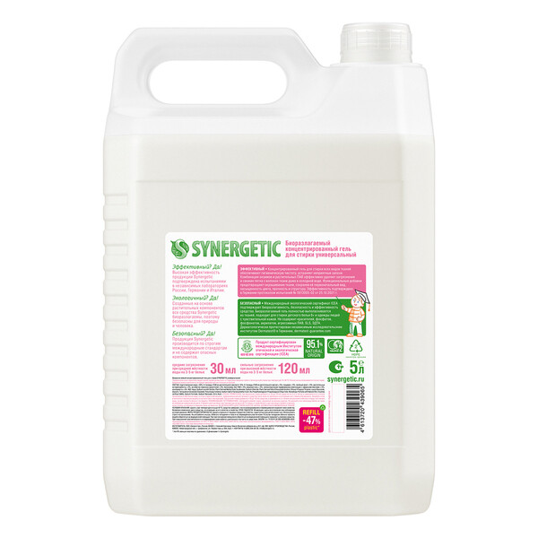 Биоразлагаемый концентрированный гель для стирки Synergetic универсальный обеспечивает бережное и эффективное очищение тканей, гигиеническую чистоту одежды и устраняет неприятные запахи. Комбинация энзимов и растительных ПАВ эффективно удаляет загрязнения и свежие пятна с волокон ткани даже в холодной воде. Функциональные добавки предотвращают окрашивание, а также повторное оседание загрязнений на ткани, сохраняя ее первоначальный вид, насыщенность цвета, прочность и структуру. Гипоаллергенная отдушка на основе эфирных масел оставляет легкий и приятный аромат. Гель предназначен для стирки всех видов тканей, кроме деликатных и мембранных, а также шерсти и шелка. Средство можно использовать в стиральных машинах любого типа и при ручной стирке при температуре 15-90°C. Биоразлагаемый гель полностью выполаскивается из тканей, подходит для сти...