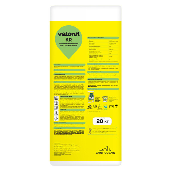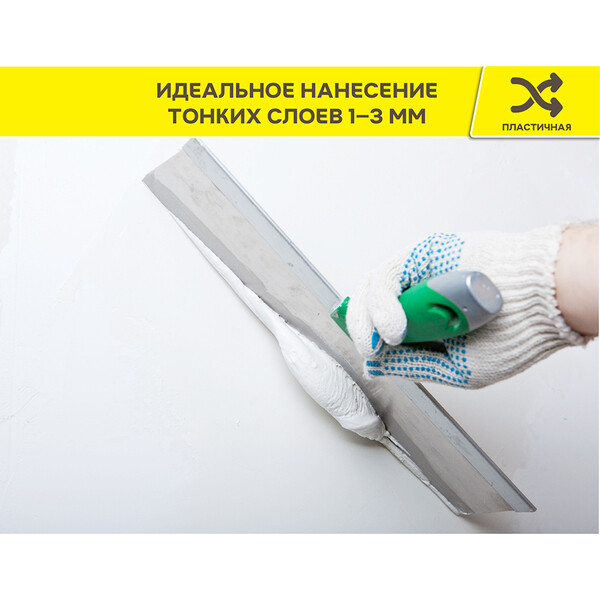 Сухая финишная шпаклевка на органическом связующем. Предназначена для финишного выравнивания стен и потолков в сухих помещениях перед оклейкой обоями и покраской. Имея максимальный размер зерна всего 0,3 мм, она позволяет создать гладкий матовый защитный слой. Наносится ручным и машинным способом. Применяется для внутренних работ