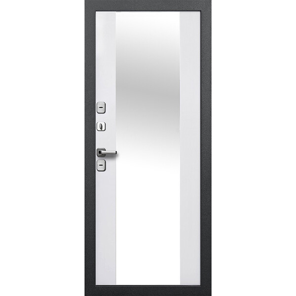 Предназначена для установки в качестве уличной входной двери в домах, коттеджах, таунхаусах. Полотно изготовлено из стали. С внутренней стороны облицована МДФ-панелью 10 мм, с зеркалом , цвет – эмалит белый.