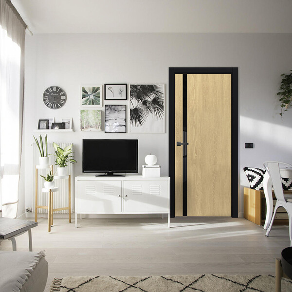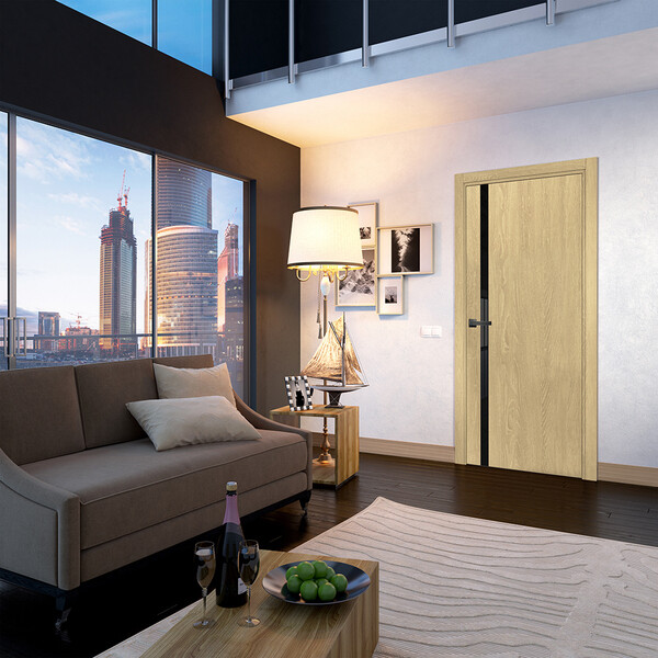 Предназначена для установки в жилых и общественных помещениях, например, квартирах, офисах, магазинах, салонах и др. Каркас двери – горизонтальные перекладины и вертикальные стойки из ДСП и МДФ, наполнение сотопанель. Поверхность полотна – МДФ плита, покрытая ПВХ покрытием. Декоративная вертикальная вставка из стекла Лакобель черного цвета. Лакобель (Lacobel) – декоративное цветное стекло, окрашенное с одной стороны в черный цвет, с другой стороны – имеющее глянцевую поверхность. Дверная монтажная коробка, наличники, добор (при необходимости), петли, ручки, фиксатор (при необходимости) приобретаются отдельно.