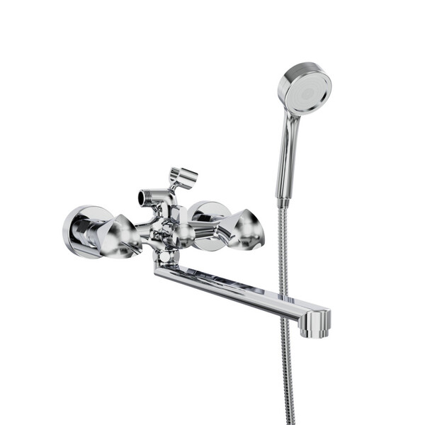 Смеситель для ванной с длинным изливом серии Edo – Двухвентильный смеситель собран из отлитых из латуни деталей. Их поверхность хромирована гальваническим способом, о чём свидетельствует зеркально серебристый внешний вид крана. Вынос сливного отверстия над ванной относительно оси корпуса составляет 35 см. Излив свободно вращается в обе стороны.Сверху в корпус ввинчивается шланг длиной 1,5 м с душевой лейкой. Между ручками расположен поворотный переключатель подачи воды в излив или душ.