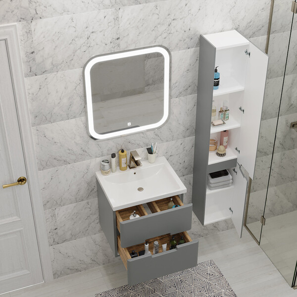 Тумба подвесная Noche 50 комплектуется раковиной Комо 50. Выполнена в современном стиле. Корпус изготовлен из влагостойкого ЛДСП, фасады из МДФ, покрытые матовой пленкой Графит Софт. Два выдвижных ящика с направляющими скрытого монтажа и доводчиками имеют мягкое закрывание.