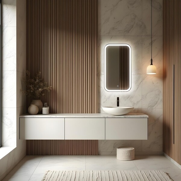 Прямоугольное зеркало со скругленными углами имеет фронтальную LED-подсвету, которая обеспечивает направленное, мягкое освещение лица без теней и бликов. Управляется сенсорным выключателем. Функция диммера позволяет плавно отрегулировать яркость. Функция памяти предназначена для запоминания последней настройки яркости.