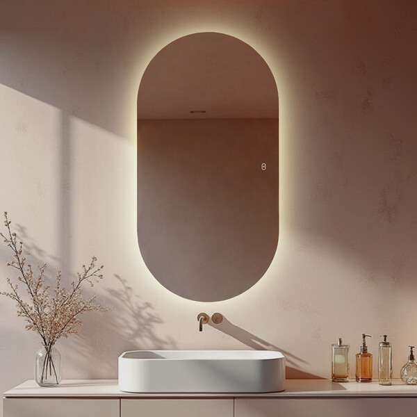 Зеркало капсульной формы с интерьерной LED-подсветкой. Светодиоды расположены за отражающей поверхностью, отбрасывают свет вокруг и создают эффект «парящего» зеркала. Подсветка управляется сенсорным выключателем. Функция диммера позволяет плавно отрегулировать яркость. Функция памяти предназначена для запоминания последней настройки яркости. Три режима свечения помогут создать в пространстве нужную атмосферу. Функция подогрева исключает запотевание зеркальной поверхности в ванной комнате.