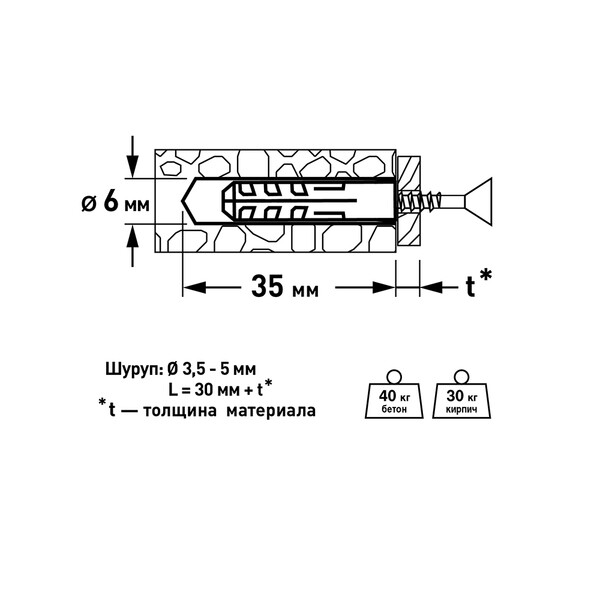 | Диаметр дюбеля, мм | 6 |