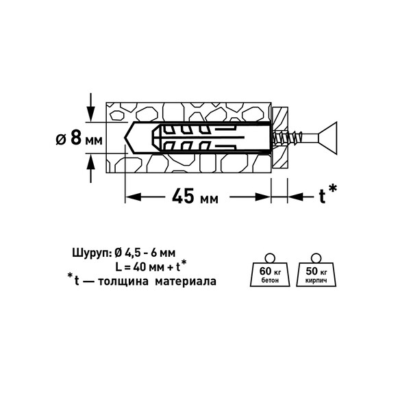 Предназначен для легких креплений (небольшие нагрузки) в бетон и полнотелый кирпич. В дюбель рекомендуется устанавливать универсальный саморез, так как угол, шаг и заточка резьбы такого самореза производит правильное раскрытие дюбеля в отверстии, что позволяет выдерживать большие нагрузки в отличие от черных саморезов (ГД).