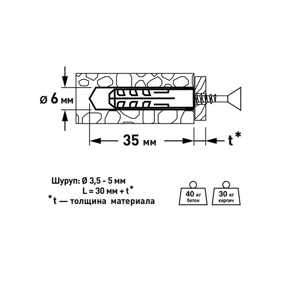 Предназначен для легких креплений (небольшие нагрузки) в бетон и полнотелый кирпич. В дюбель рекомендуется устанавливать универсальный саморез, так как угол, шаг и заточка резьбы такого самореза производит правильное раскрытие дюбеля в отверстии, что позволяет выдерживать большие нагрузки в отличие от черных саморезов (ГД).