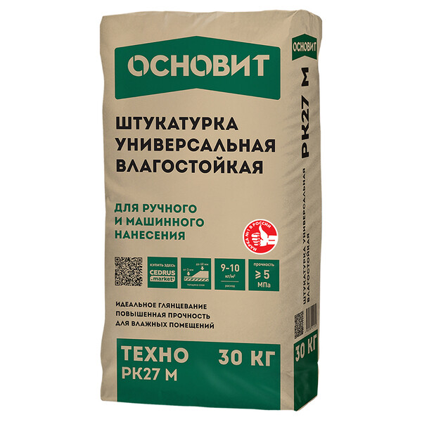 Штукатурка гипсовая универсальная Основит ТЕХНО PK27 М предназначена для выравнивания стен и потолков в помещениях с повышенной влажностью под оклеивание обоями окрашивание, облицовку плиткой. Наносится слоем от 3 до 30 мм без штукатурной сетки.