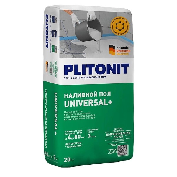 Ровнитель универсальный самовыравнивающийся на минеральной основе. Предназначен для выравнивания и корректирования бетонных полов и монолитных цементных и полимер-гипсовых стяжек, внутри сухих и влажных жилых помещений. Подходит под укладку керамической плитки, линолеума, ковролина, паркета, ламината и использования в системе «теплый пол». Толщина выравнивания 2-80 мм.