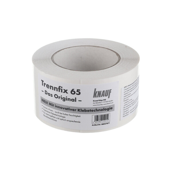 Лента разделительная Кнауф Треннфикс – это бумажная лента шириной 65 мм со специальным антиадгезионным покрытием с одной стороны и клеевым слоем с другой стороны. Применяется для создания искусственных трещин между каркасными конструкциями и примыкающими массивными поверхностями, для создания скользящего соединения каркасных конструкций, для разделения штукатурных поверхностей вместо надреза штукатурной пилой.