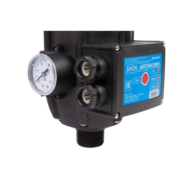 Предназначен для автоматического регулирования работы насоса и защищает его в случае отсутствия воды (сухой ход). Помимо этого, электроника запускает электронасос при снижении давления в системе, когда открываются краны, а также останавливает его, когда вода прекращает движение, когда краны закрываются. Блок автоматики комплектуется манометром, для зрительного контроля общего давления в системе, и реле давления.