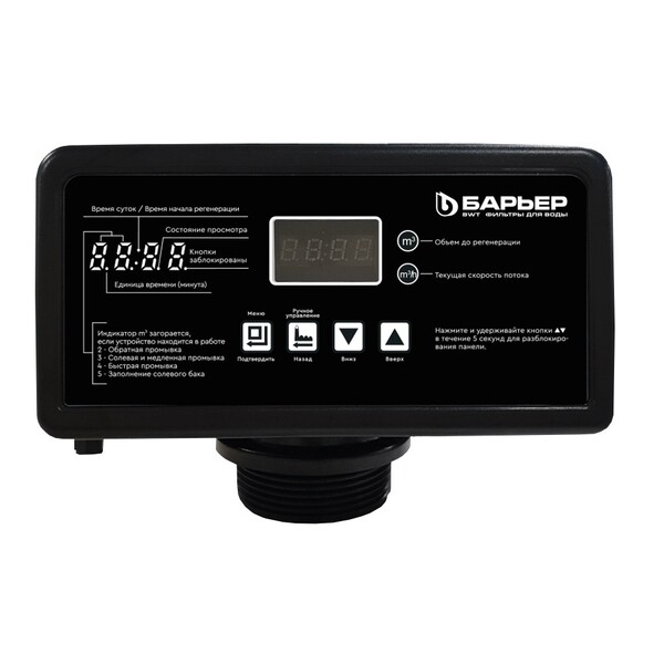 Автоматический блок управления Барьер Pro100 RV 3/4" регулирует процессы промывки фильтров в автоматическом режиме. Обеспечивает своевременную регенерацию фильтрующей засыпки Ecomix, а также позволяет использовать засыпки других брендов. Автоматический блок имеет защитную функцию от детей и случайного сбоя настроек потребителем в виде блокировки кнопок дисплея, которое происходит автоматически после 1 минуты, если не выполняется никаких действий с кнопками блока управления. Блок управления осуществляет регенерацию засыпки при исчерпании ее ресурса. Регенерация настраивается через меню блока по дням и по объему очищенной воды. Отсчет происходит благодаря встроенному датчику расхода воды.