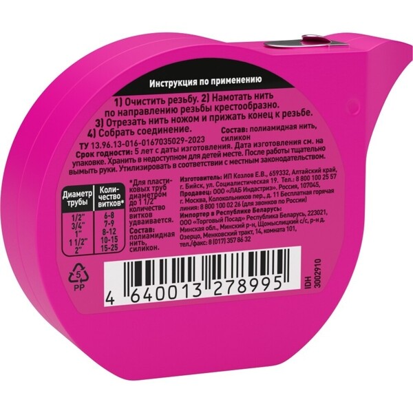 Универсальная нить для герметизации резьбовых соединений труб. Изготовлена из полиамида, пропитана герметиком на основе высоковязкого невысыхающего силиконового состава. Предназначена для сборки резьбовых соединений и установки арматуры при монтаже трубопроводов горячей и холодной воды, а также сжатого воздуха, для герметизации трубных резьбовых сетей газораспределения.