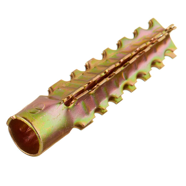 Предназначен для крепежа навесных конструкций к пористой поверхности стен. Конструкция дюбеля имеет 4-х сегментную распорную часть с внешними зубцами, благодаря которым обеспечивается высокая несущая способность в слабых видах основания. За счет острых зубцов дюбель не проворачивается в мягком материале основания при вкручивании в него крепежа. Дюбель выполнен из металла, поэтому его можно применять в пожароопасных зонах. Допускается устанавливать без предварительного сверления в газобетон низкой плотности. Применяются при установке дверей, окон, решеток, прокладке трубопроводов. Диаметр отверстия для установки – 7–9 мм