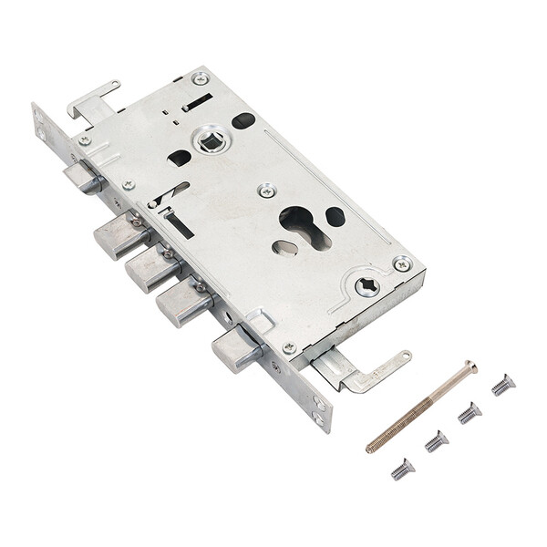 Замок врезной цилиндровый с защелкой, без механизма секрета. Предназначен для установки в китайские металлические двери, в качестве основного замка. Реверсивная защелка позволяет устанавливать замок на правые и левые двери. Три стальных ригеля. 3 точки запирания.