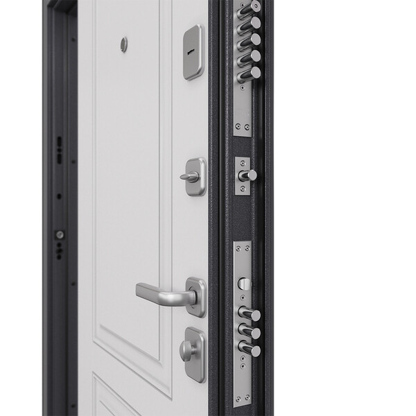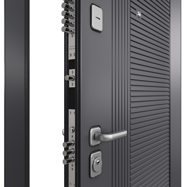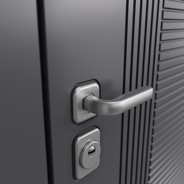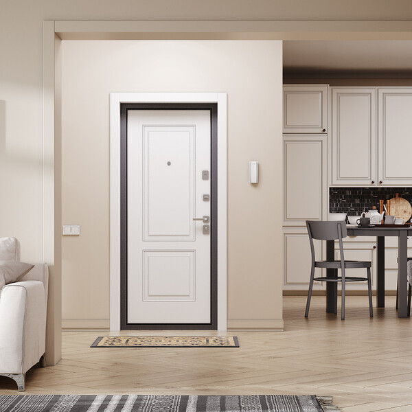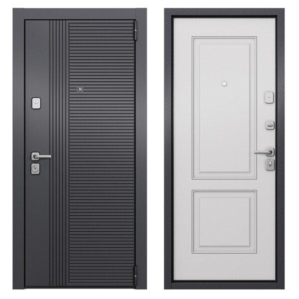 Предназначена для установки в жилых и общественных зданиях в качестве входной двери внутри помещения. Полотно изготовлено из стали. Стальной лист 1,4 мм с атмосферостойким порошковым покрытием цвета "Темно-серый букле графит"; с внешней отделкой МДФ в цвете "Оскуро" с декоративной отделкой; с внутренней стороны МДФ в цвете "Бьянко". Наполнение – минеральная плита + пенополистирол.