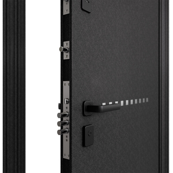 Предназначена для установки в жилых и общественных зданиях в качестве входной двери внутри помещения. Полотно изготовлено из стали. Стальной лист 1,4 мм с атмосферостойким порошковым покрытием цвета "Черный шелк"; с внутренней стороны МДФ в цвете "Дуб беленый" + зеркало. Наполнение – минеральная плита.