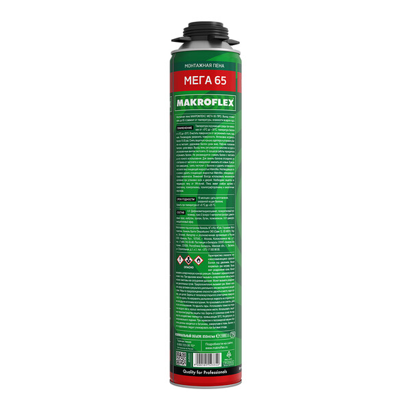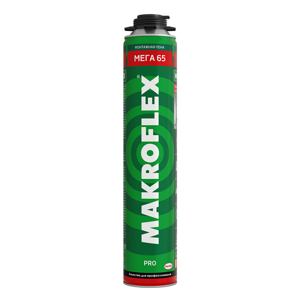 Высококачественная однокомпонентная, отверждаемая за счет реакции с влагой воздуха, полужесткая полиуретановая пена с увеличенным выходом с превосходным соотношением открытых-закрытых ячеек и высокой механической прочностью. Макрофлекс наносится при помощи специального монтажного пистолета. Для получения наилучшего результата рекомендуется использовать пистолеты, испытанные и утвержденные производителем продукта. Выход готовой пены до 65 л.