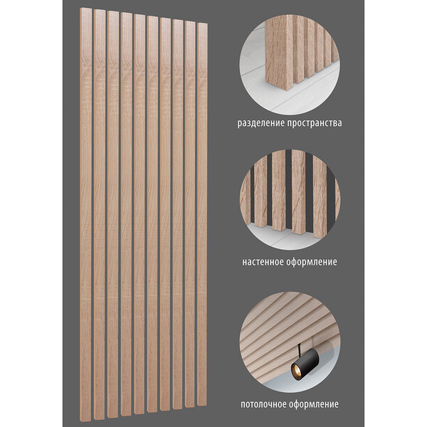 Интерьерная рейка изготовлена из МДФ, покрыта износостойкой пленкой. Применяется для создания реечных потолков, реечных перегородок, реечных стен в интерьерах, для зонирования и в декоративных целях. Простой монтаж позволяет устанавливать рейку на монтажную планку ПВХ (приобретается отдельно), либо приклеивать с помощью монтажного клея.