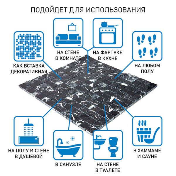 Предназначена для облицовки пола и стен внутри жилых (ванные комнаты, туалеты, прихожие, гостиные, закрытые балконы), коммерческих помещений (магазины, кафе, отели, и т.п.), жилых зданий и вспомогательных нежилых помещений. Мозаика продается поштучно.