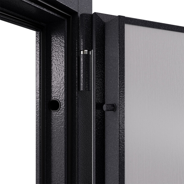 Предназначена для установки в жилых и общественных зданиях в качестве входной двери внутри помещения. Полотно изготовлено из стали. Стальной лист 1 мм с атмосферостойким порошковым покрытием цвета "Темно-серый букле графит", панель МДФ в цвете "Дуб белый матовый". Наполнение – пенополистирол.