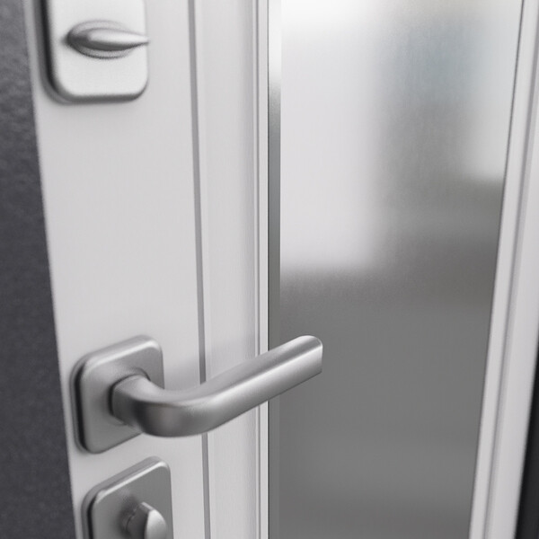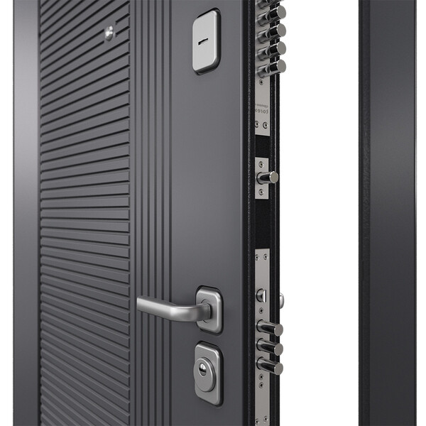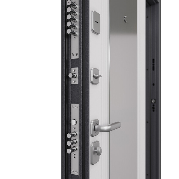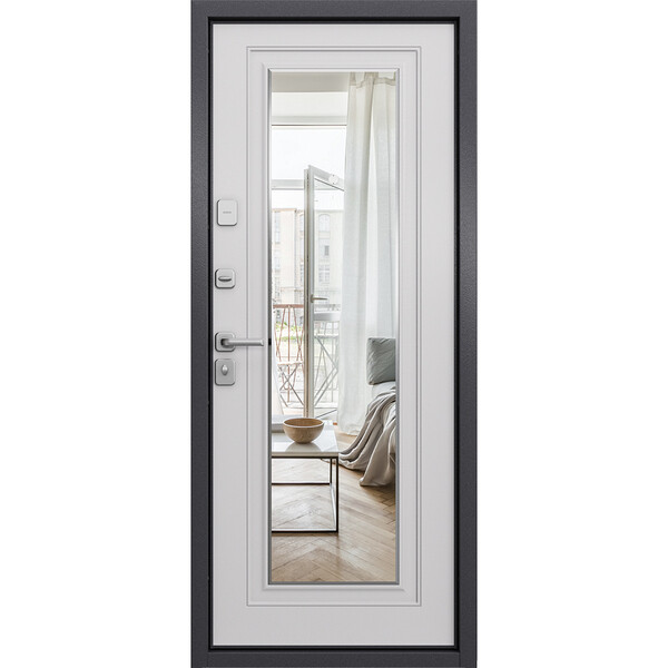 Предназначена для установки в жилых и общественных зданиях в качестве входной двери внутри помещения. Полотно изготовлено из стали. Стальной лист 1,4 мм с атмосферостойким порошковым покрытием цвета "Темно-серый букле графит"; с внешней отделкой МДФ в цвете "Оскуро" с декоративной отделкой; с внутренней стороны МДФ в цвете "Бьянко" + зеркало. Наполнение – минеральная плита + пенополистирол.