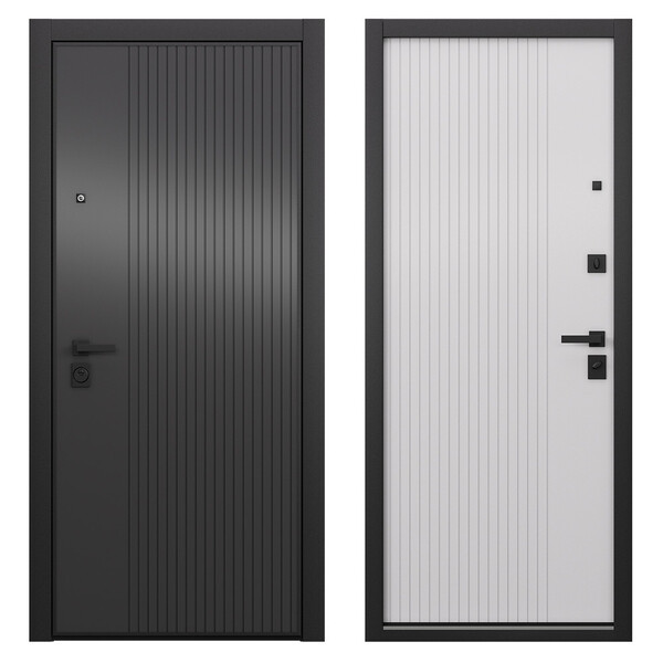 Предназначена для установки в жилых и общественных зданиях в качестве входной двери внутри помещения. Полотно изготовлено из стали, усиленное вертикальными ребрами жесткости. Стальной лист 2 мм с атмосферостойким порошковым покрытием цвета "Колоре неро"; панель МДФ в цвете "Бьянко". Наполнение – изолон, минеральная плита высокой плотности, пенофол, виброшумоизоляция SGM мембрана M2H. Короб – цельногнутый профиль закрытого типа+хромпакет, утепленный.