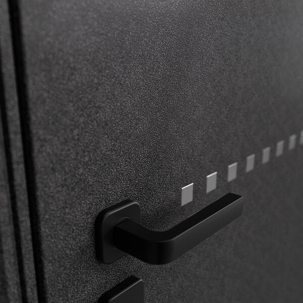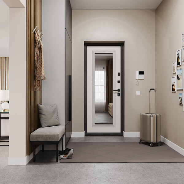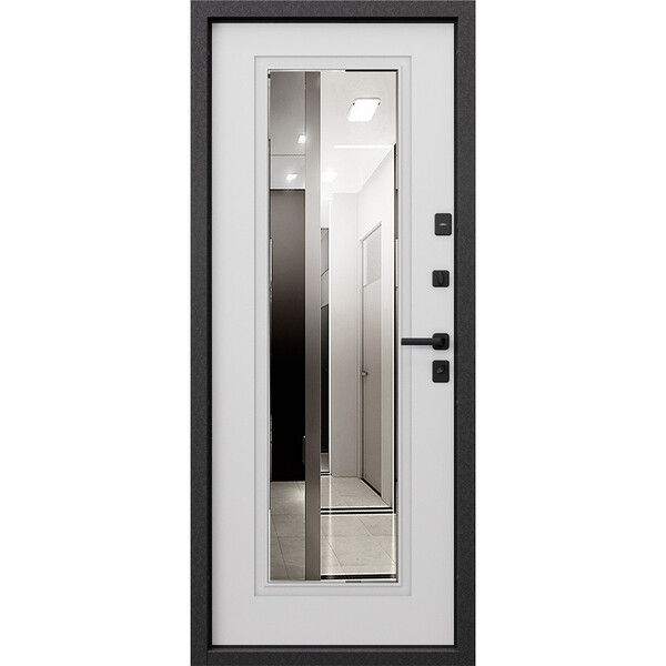 Предназначена для установки в жилых и общественных зданиях в качестве входной двери внутри помещения. Полотно изготовлено из стали. Стальной лист 1,4 мм с атмосферостойким порошковым покрытием цвета "Черный шелк"; с внутренней стороны МДФ в цвете "Дуб беленый" + зеркало. Наполнение – минеральная плита.