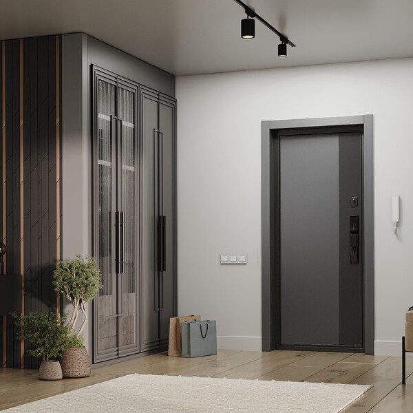 Предназначена для установки в жилых и общественных зданиях в качестве входной двери внутри помещения. Полотно изготовлено из стали. Стальной лист 1,4 мм с атмосферостойким порошковым покрытием цвета "Темно-серый букле графит"; с внешней отделкой МДФ в цвете "Оскуро + Черная шагрень" с декоративной отделкой; с внутренней стороны МДФ в цвете "Оскуро + Черная шагрень" с декоративной отделкой. Наполнение – пенополистирол+слой вибро – звукоизоляционного материала SGM. Дверь подразумевает установку электронного замка.