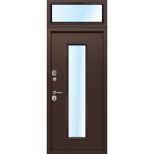 Дверь входная 7,5 см Гарда с остекленной фрамугой 960 мм левая предназначена для установки в технических, жилых и общественных зданиях в качестве входной двери внутри помещения. Полотно изготовлено из стали. Стальной лист 1 мм с атмосферостойким порошковым покрытием цвета "Медный антик". С внутренней стороны облицовано атмосферостойким порошковым покрытием цвета "Медный антик". Анкерные болты в комплект не входят и приобретаются отдельно. Диаметр отверстий под анкер – 25 мм. Длина анкера подбирается под тип стены. Размер стеклопакета на фрамуге 281х815 мм, полотне 1496х281 мм. Видимая часть светопрозрачной конструкции составляет фрамуга 277х811 мм, полотно 1491х277 мм. Стеклопакет двухкамерный толщиной 36 мм (толщина одного стекла 4 мм).