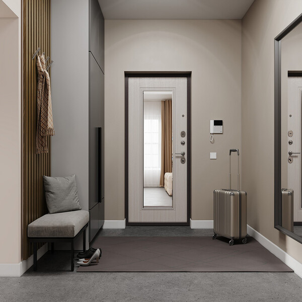 Предназначена для установки в жилых и общественных зданиях в качестве входной двери внутри помещения. Стальная дверь используется для установки в квартирах, загородных домах и офисах. Дверь обладает высокой устойчивостью к повреждению, приятный эстетичный вид. На внутренней стороне смонтировано зеркало, облицовано фрезерованной МДФ-панелью, цвет "Ларче бьянко".