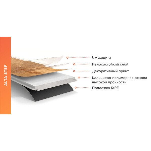 В напольное покрытие Alta Step уже изначально интегрирована специальная подложка из IXPE материала. IXPE – физически сшитый полиэтилен высокой плотности. Подложка является 100% влагостойкой. SPC (Каменно-полимерный композит) – это последнее поколение группы виниловых покрытий. Это единая жесткая минеральная основа, спрессованная под высоким давлением с декоративной пленкой и защитным покрытием. Известняк (карбонат кальция) соединяется с поливинилхлоридом в пропорции 75/25. Преобладание минерального наполнителя в едином композитном слое обеспечивает водостойкость, стабильность, прочность, сочетаемость с теплыми полами, простоту укладки.